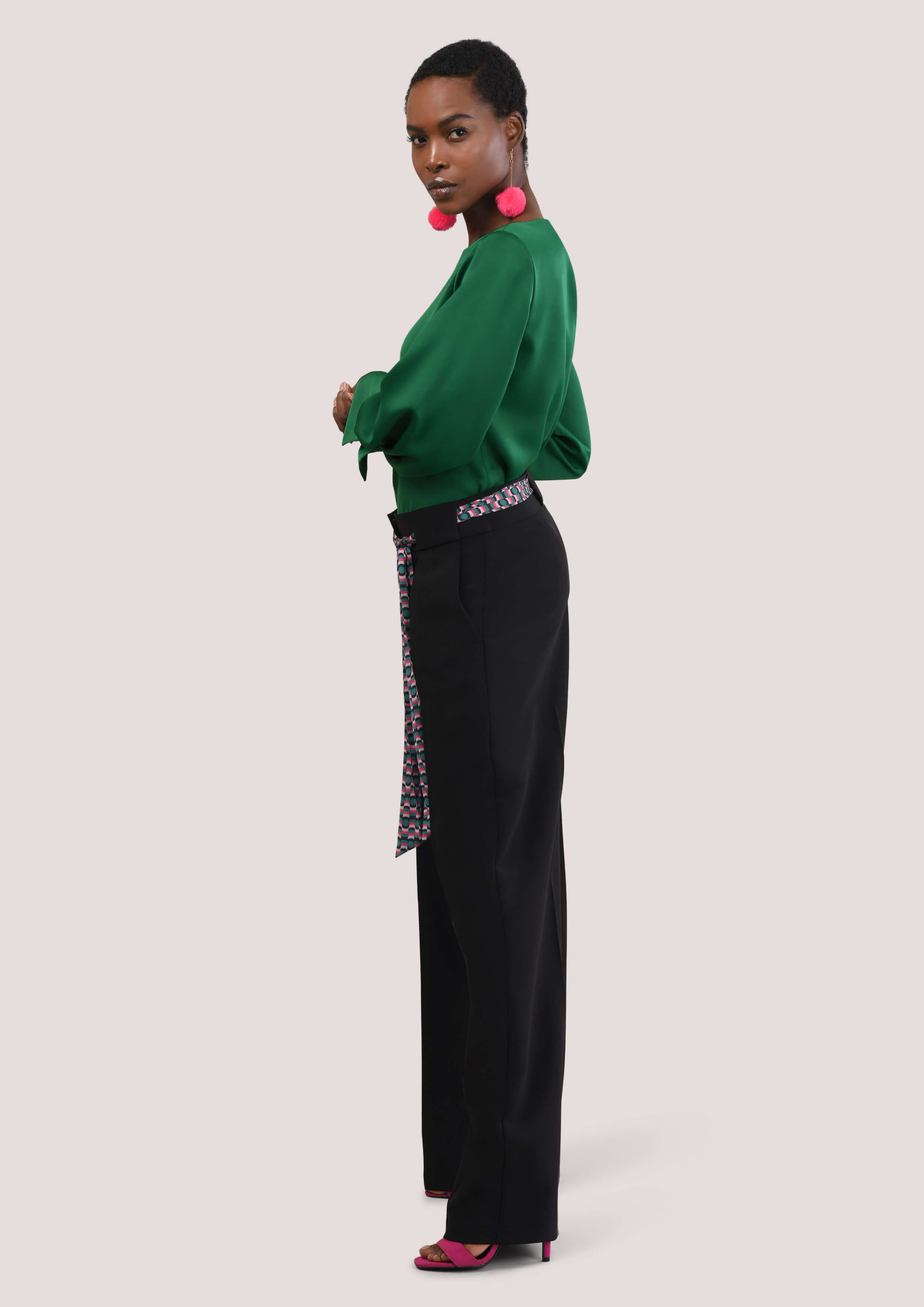 ترقية لخزانة العمل الخاصة بك مع هذه السراويل السوداء مطوي. مع حزام ربطة عنق منقوشة باللونين الأخضر والزهري ، تُظهر هذه البنطلون جانبك الممتع والجذاب.