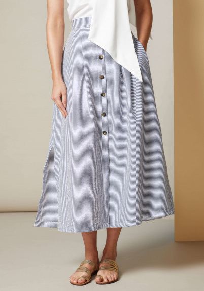 نحن نحب هذا اللباس الأنيق على زر تنورة ميدي. قم بتجميع ملابسك في الصيف مع بلوزة بيضاء وصنادل أو ارتديه مع بلوزة وأوتاد.