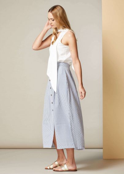 نحن نحب هذا اللباس الأنيق على زر تنورة ميدي. قم بتجميع ملابسك في الصيف مع بلوزة بيضاء وصنادل أو ارتديه مع بلوزة وأوتاد.