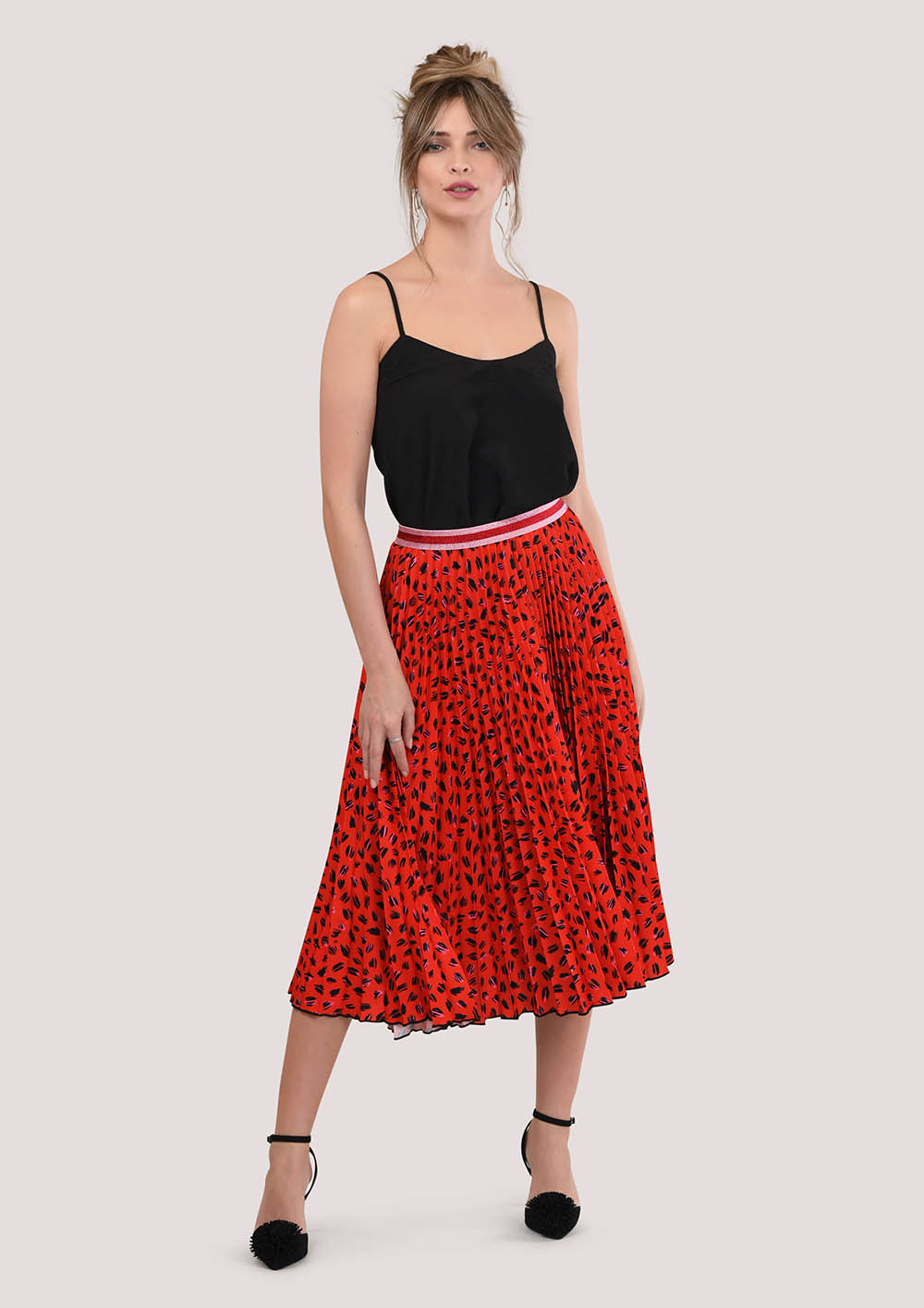 لدينا تنورة مطوي أصبحت بسرعة واحدة من الكلاسيكية لدينا. قدمنا لمسة فريدة من نوعها مع طباعة الفهد الأحمر وحزام معدني. ارتديها مع بلوزة سوداء أو بيضاء لإطلالة جذابة ولكن أنيقة.