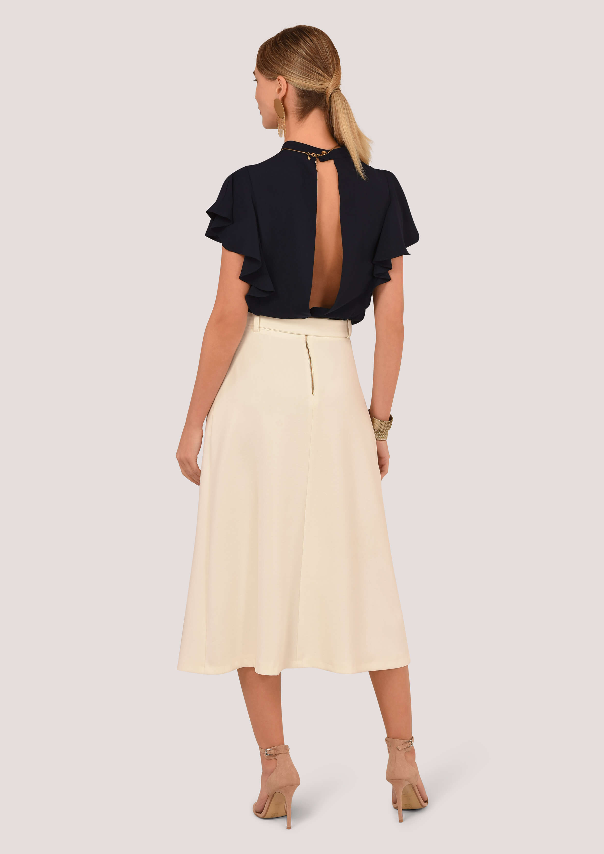 نحن نحب هذا اللباس الأنيق على زر تنورة ميدي. سنقوم بتكاتف فريقنا مع قمة مزينة بأحجار زاهية وكعوب ذهبية لتتناسب مع تفاصيل الذهب على الأزرار والحزام.