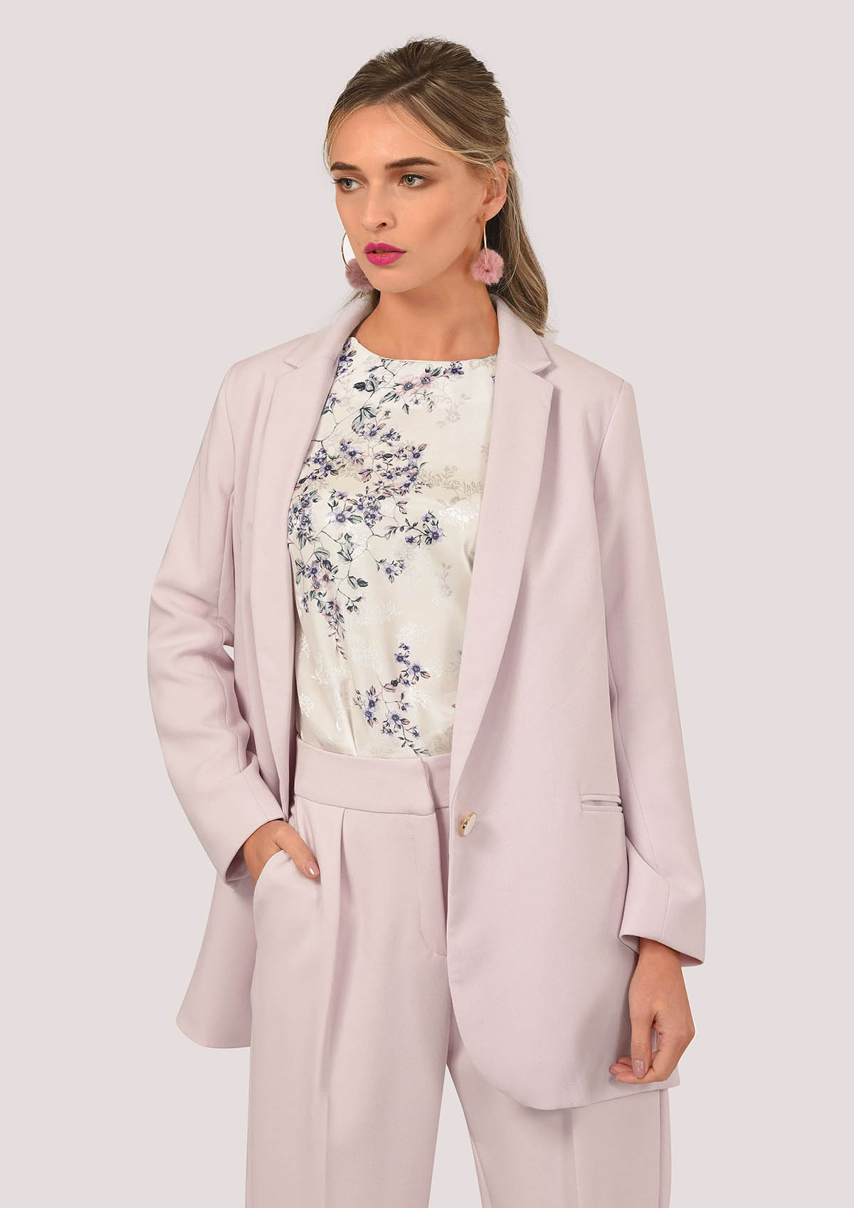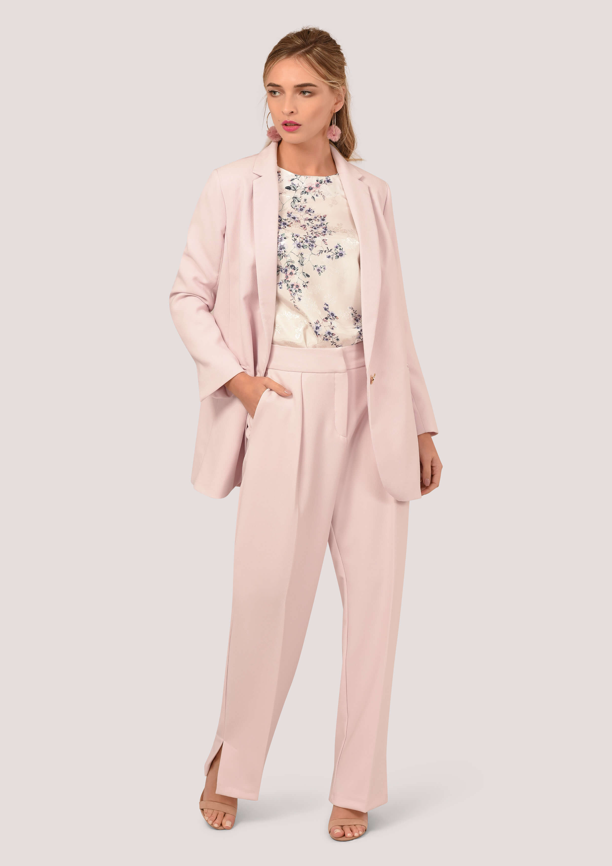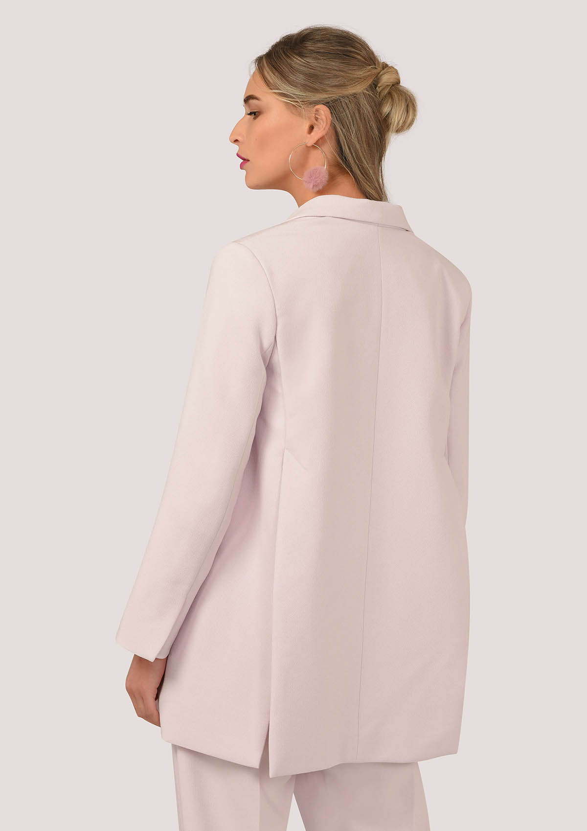 نحن نحب هذا مختلف تأخذ سترة مصممة مع الشقوق الظهر العصرية. قم بإقرانها مع بنطلون وردي مطابق لأثر البدلة الكاملة.